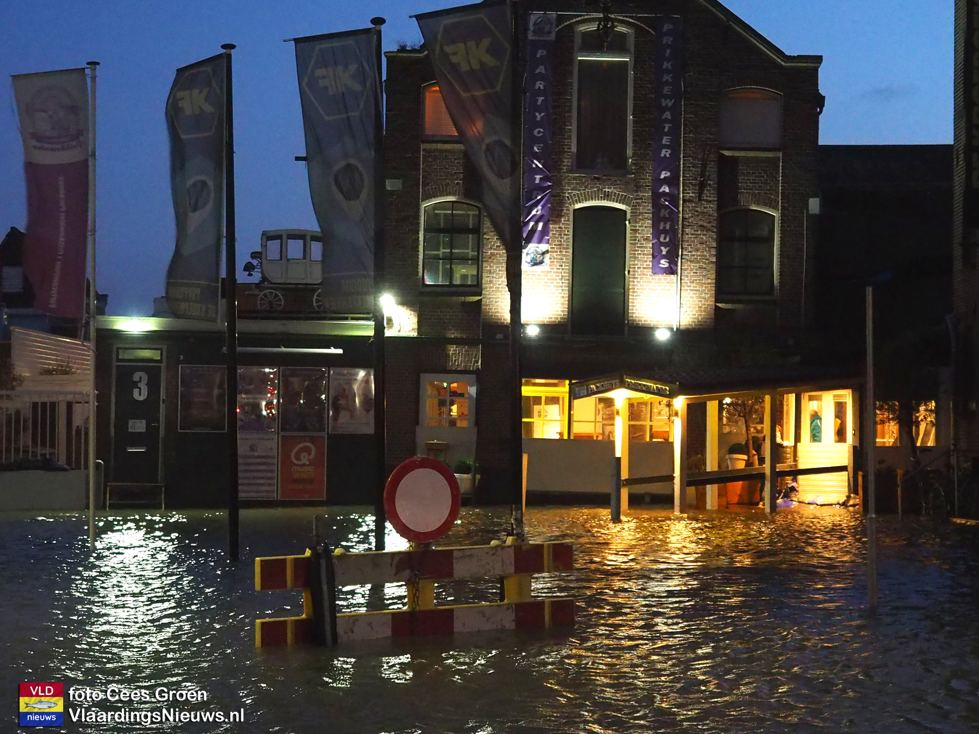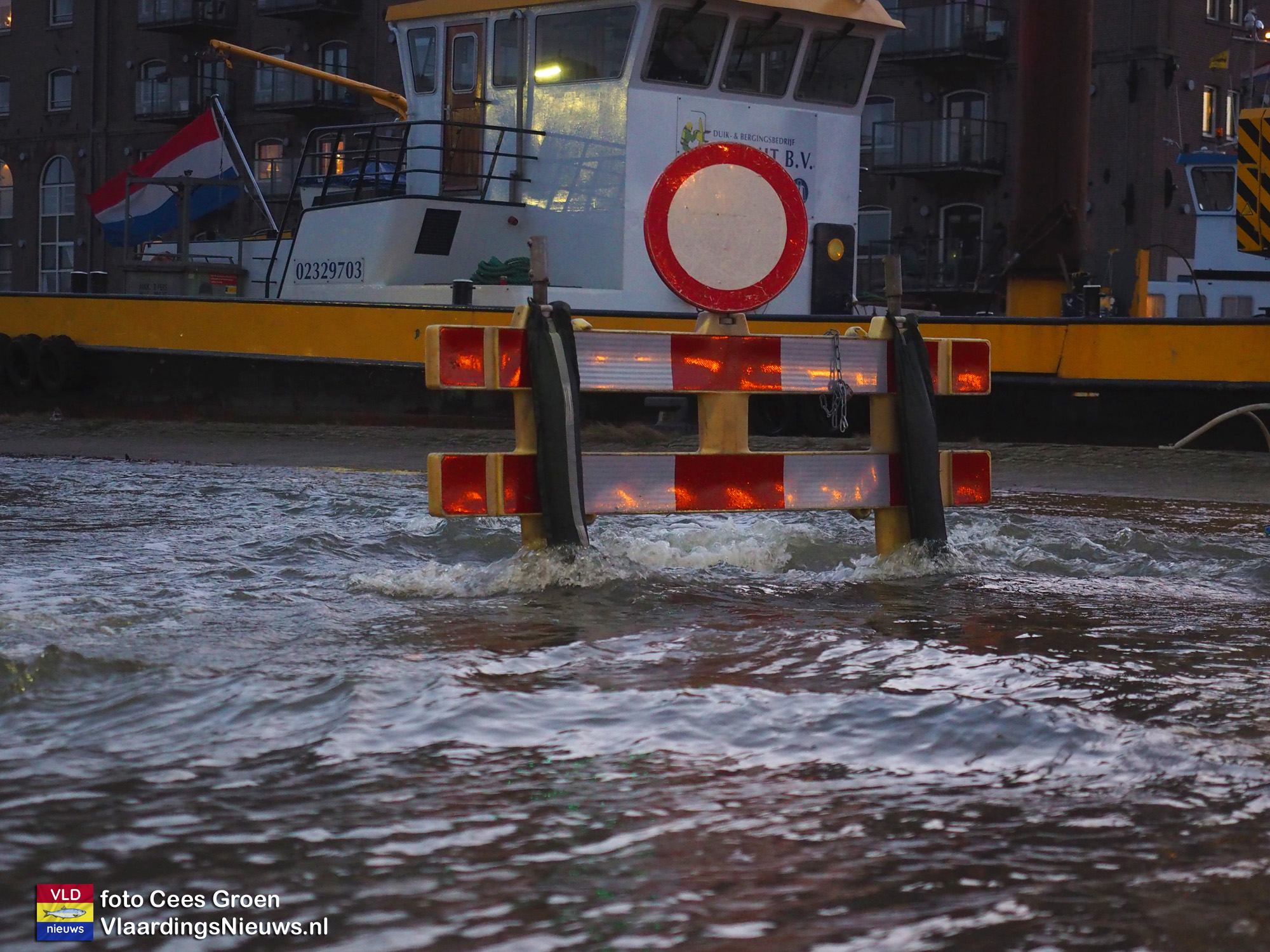 Het springtij in combinatie met de harde wind, maakte het hoogwater extra hoog deze middag. De gemeente had kades uit voorzorg afgezet met hekken om inrijden van de lage gedeeltes van de kades te voorkomen.